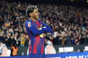 体育资讯3月1日讯 西甲第26轮,巴萨主场对阵比利亚雷亚尔,18岁亚马尔半场梅开二度。